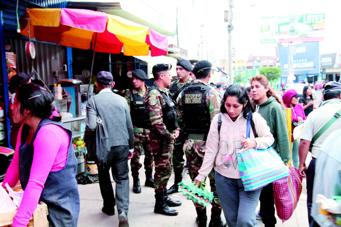 Un grupo de 70 policías y 25 miembros del Ejército vigila la plataforma comercial Andrés Avelino Cáceres, desde ayer, para verificar el cierre de tiendas que no venden alimentos, durante 15 días, con el objetivo de prevenir el coronavirus.