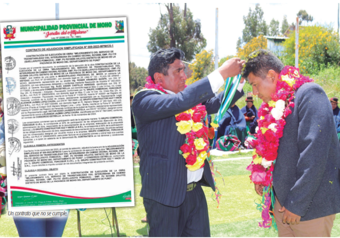 Más, este informe advierte una situación preocupante. Se trata de la ejecución de la obra “Mejoramiento de los servicios de transitabilidad vial interurbana en camino vecinal Quellahuyo Pomaoca – Viluyo, distrito y provincia de Moho”. A estas alturas, esta infraestructura vial debió estar culminada y entregada, de acuerdo al contrato firmado el 12 de diciembre de 2023, por el gerente general de la Municipalidad Provincial de Moho, Álex Castillo Venegas y la representante del Consorcio Estrella (Grupo Comercial Fercosur S.R.L. y Grupo Constructor JAZ y Hnos. La S.R.L.), Eleonor López Chura.