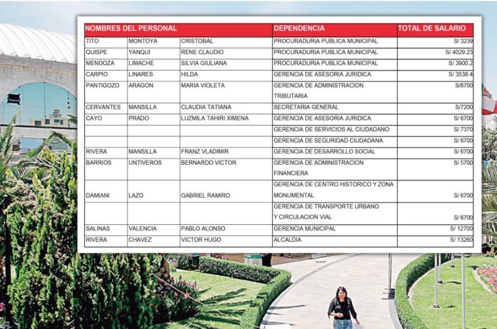Durante el 2025, el alcalde Víctor Hugo Rivera Chávez percibe un ingreso mensual de S/ 13,260, mientras que el gerente municipal Pablo Alonso Salinas Valencia gana S/ 12,700. A ellos se suman los gerentes de línea de áreas estratégicas como Seguridad Ciudadana, Transporte Urbano, Desarrollo Social, Asesoría Jurídica, Centro Histórico y Administración Tributaria, cuyos sueldos oscilan entre S/ 6,700 y S/ 7,370. La secretaria general, Claudia Tatiana Cervantes Mansilla, recibe S/ 7,200 mensuales, consolidándose como uno de los cargos administrativos mejor remunerados.