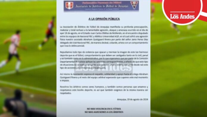 «Esperamos que por parte de la Comisión Departamental de Justicia aplique las sanciones correspondientes… y así generar un precedente que corte desde raíz este tipo de acciones y/o conductas delincuenciales», es parte del pronunciamiento de la Asociación de Árbitros de Fútbol de Arequipa a raíz de la agresión física del delegado de Nacional de Mollendo, Janio Perea, al árbitro Abraham Quistgaard.