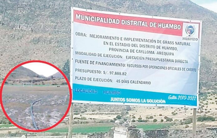 La obra, denominada “Mejoramiento e Implementación de Grass Natural en el Estadio del Distrito de Huambo, Provincia de Caylloma, Arequipa”, fue ejecutada en el año 2022 durante la gestión del exalcalde Getulio Huaira Soto, con un presupuesto de S/ 97,888 financiado con recursos por operaciones oficia les de crédito.
