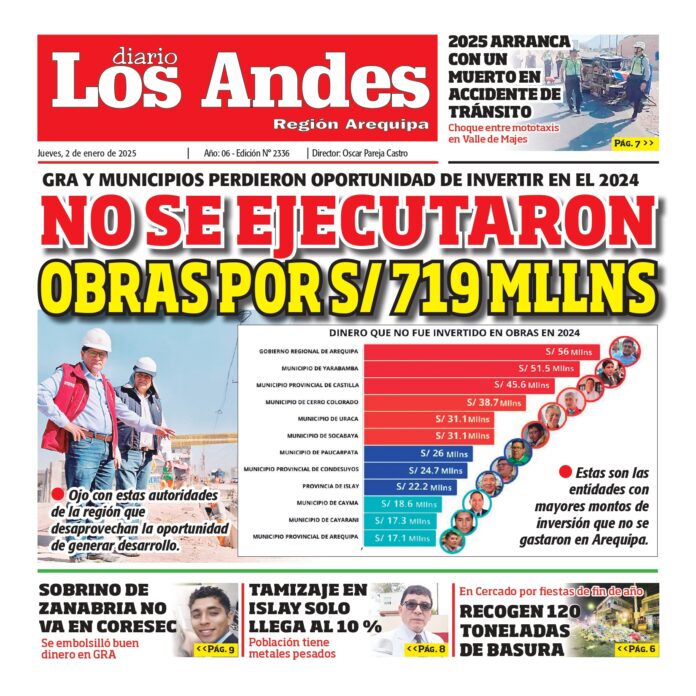 Por: Diario los Andes Fecha: enero 2, 2025 DIARIO DIGITAL AREQUIPA: Diario los Andes 02/01/2025 Vistas: 25 TagsArequipaDiario DigitalDiario Los Andes Artículo anteriorAREQUIPA: Diario los Andes 01/01/2025Artículo siguientePUNO: Diario los Andes 02/01/2025 Diario los Andes Compartir post: FacebookTwitterPinterestWhatsApp Suscríbete Quiero entrar He leído y acepto la Política de Privacidad. Populares Crean la Universidad Nacional Tecnológica Intercultural de Pomata Puno: Detectan conexiones clandestinas de aguas residuales Puno: Sereno grave tras ser embestido por combi de empresa “Dorado” Contraloría dispone que regidores y consejeros rindan cuentas Puno: Alianza con dirigentes magisteriales fue clave Más vistosMás vistos Crean la Universidad Nacional Tecnológica Intercultural de Pomata admineditor - abril 14, 2026 En el diario oficial El Peruano, se publicó la... Puno: Detectan conexiones clandestinas de aguas residuales admineditor - abril 14, 2026 La comuna provincial de Puno en coordinación con EMSA... Puno: Sereno grave tras ser embestido por combi de empresa “Dorado” admineditor - abril 14, 2026 Un agente de Serenazgo de la Municipalidad de Puno... Contraloría dispone que regidores y consejeros rindan cuentas admineditor - abril 14, 2026 La Contraloría General de la República dispuso que regidores...