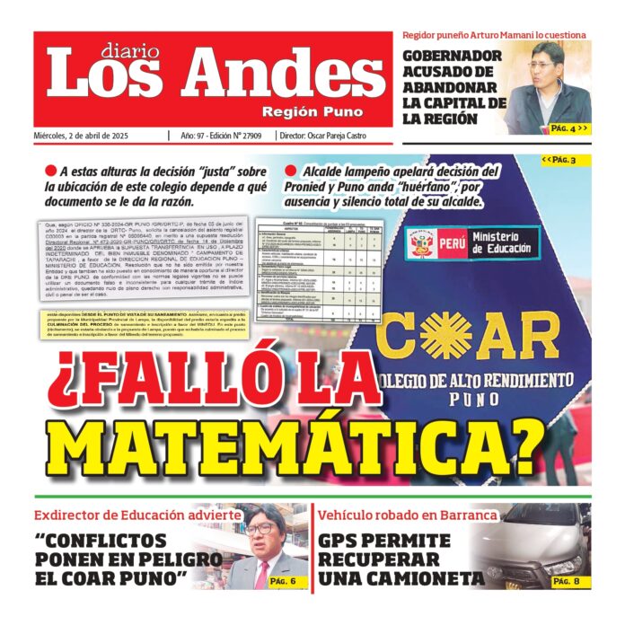 Por: Diario los Andes Fecha: abril 1, 2025 DIARIO DIGITAL PUNO: Diario los Andes 02/04/2025 Vistas: 79 TagsDiario DigitalDiario Los AndesPuno Artículo anteriorAREQUIPA : Diario los Andes 02/04/2025Artículo siguienteESPECIAL: Puquina Quta 31/03/2025 Diario los Andes Compartir post: FacebookTwitterPinterestWhatsApp Suscríbete Quiero entrar He leído y acepto la Política de Privacidad. Populares Arequipa: Ninguno participó en la sesión solemne por los 37 años del Gobierno Regional Arequipa: Quejas sobre obra en Yanahuara Incautan mercancía de contrabando valorizada en más de S/32 mil en Desaguadero Liberan más de 31 mil alevinos de Carachi en Lagunillas COER alerta lluvias en provincias del norte de la región Puno Más vistosMás vistos Arequipa: Ninguno participó en la sesión solemne por los 37 años del Gobierno Regional admineditor - abril 15, 2026 Redacción: Jean Frisancho Consejeros no asistieron a ceremonia de la... Arequipa: Quejas sobre obra en Yanahuara admineditor - abril 15, 2026 Redacción: Jean Frisancho Cerraron pase peatonal en puente provisional de... Incautan mercancía de contrabando valorizada en más de S/32 mil en Desaguadero admineditor - abril 15, 2026 Un operativo conjunto entre la Policía Nacional del Perú... Liberan más de 31 mil alevinos de Carachi en Lagunillas admineditor - abril 15, 2026 Un total de 31 mil 800 alevinos de carachi...