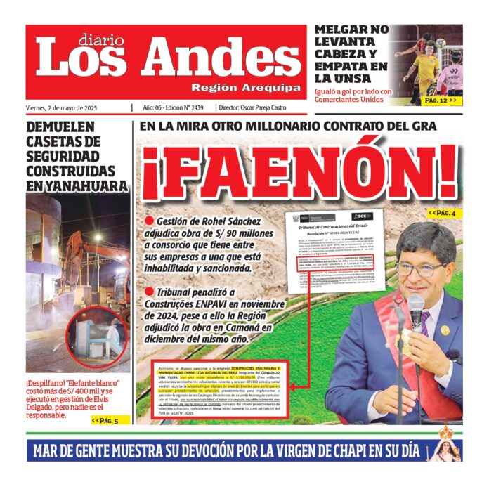 Por: Diario los Andes Fecha: mayo 2, 2025 DIARIO DIGITAL AREQUIPA: Diario los Andes 02/05/2025 Vistas: 39 Artículo anteriorPUNO: Diario los Andes 01/05/2025Artículo siguientePUNO: Diario los Andes 02/05/2025 Diario los Andes Compartir post: FacebookTwitterPinterestWhatsApp Suscríbete Quiero entrar He leído y acepto la Política de Privacidad. Populares AREQUIPA: Diario Los Andes 08/02/2026 PUNO: Diario Los Andes 08/02/2026 Identifican a supuesta «campesina» que respaldó a López Aliaga en Puno: Ser´8ia dirigente de Renovación Popular Gobierno retira respaldo a EGIS por corrupción: Construcción del hospital Goyoneche podría caerse Arequipa: PJ liberó a taxista acusado de violación Más vistosMás vistos AREQUIPA: Diario Los Andes 08/02/2026 Diario los Andes - febrero 7, 2026 PUNO: Diario Los Andes 08/02/2026 Diario los Andes - febrero 7, 2026 Identifican a supuesta «campesina» que respaldó a López Aliaga en Puno: Ser´8ia dirigente de Renovación Popular Diario los Andes - febrero 7, 2026 Redacción: Yudith Veronica Taco Huallpa Una nueva controversia política... Gobierno retira respaldo a EGIS por corrupción: Construcción del hospital Goyoneche podría caerse Diario los Andes - febrero 7, 2026 Redacción: Diario Los Andes El Ministerio de Economía y...