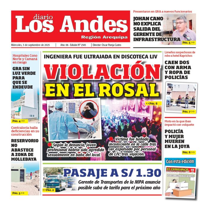 Por: Diario los Andes Fecha: septiembre 3, 2025 DIARIO DIGITAL AREQUIPA: Diario Los Andes 03/09/2025 Vistas: 28 TagsArequipaDiario DigitalDiario Los Andes Artículo anteriorPUNO: Diario Los Andes 02/09/2025Artículo siguientePUNO: Diario Los Andes 03/09/2025 Diario los Andes Compartir post: FacebookTwitterPinterestWhatsApp Suscríbete Quiero entrar He leído y acepto la Política de Privacidad. Populares DIARIO LOS ANDES PUNO: 14/03/2026 DIARIO LOS ANDES AREQUIPA: 14/03/2026 Congreso oficializa el Día del Himno Nacional Asalto a molino termina con un muerto en La Rinconada Conductor muere tras ataque incendiario a bus Más vistosMás vistos DIARIO LOS ANDES PUNO: 14/03/2026 Diario los Andes - marzo 14, 2026 DIARIO LOS ANDES AREQUIPA: 14/03/2026 Diario los Andes - marzo 14, 2026 Congreso oficializa el Día del Himno Nacional Diario los Andes - marzo 13, 2026 Redacción: Jessimiel Rosas El Congreso de la República aprobó en... Asalto a molino termina con un muerto en La Rinconada Diario los Andes - marzo 13, 2026 Redacción: Jessimiel Rosas Una persona murió durante una balacera registrada...