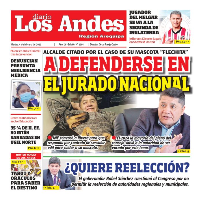 Por: Diario los Andes Fecha: febrero 4, 2025 DIARIO DIGITAL AREQUIPA : Diario los Andes 04/02/2025 Vistas: 28 TagsArequipaDiario DigitalDiario Los Andes Artículo anteriorSemanario Los Andes 03/02/2025Artículo siguientePUNO: Diario los Andes 04/02/2025 Diario los Andes Compartir post: FacebookTwitterPinterestWhatsApp Suscríbete Quiero entrar He leído y acepto la Política de Privacidad. Populares Desarticulan banda “Los finos de Sachaca” tras secuestro y extorsión a empresario Fallece ícono de literatura peruana, Alfredo Bryce Echenique, a los 87 años Grifos de Puno reportan falta de gasolina Ministerio de Energía y Minas actualiza prioridad de gas natural en Lima y Callao Ilegalmente suben el precio del pasaje urbano en Arequipa Más vistosMás vistos Desarticulan banda “Los finos de Sachaca” tras secuestro y extorsión a empresario Diario los Andes - marzo 10, 2026 Redacción: Jessimiel Rosas Agentes de la unidad de Secuestros de... Fallece ícono de literatura peruana, Alfredo Bryce Echenique, a los 87 años Diario los Andes - marzo 10, 2026 Redacción: Jessimiel Rosas El escritor peruano Alfredo Bryce Echenique falleció... Grifos de Puno reportan falta de gasolina Diario los Andes - marzo 10, 2026 Un grifo ubicado en la zona sur de la... Ministerio de Energía y Minas actualiza prioridad de gas natural en Lima y Callao Diario los Andes - marzo 10, 2026 Redacción: Jessimiel Rosas El Ministerio de Energía y Minas (Minem)...