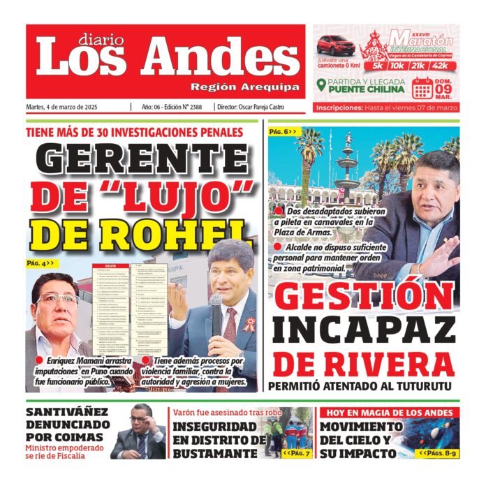 Por: Diario los Andes Fecha: marzo 4, 2025 DIARIO DIGITAL AREQUIPA : Diario los Andes 04/03/2025 Vistas: 20 TagsArequipaDiario DigitalDiario Los Andes Artículo anteriorSemanario Los Andes 03/03/2025Artículo siguientePUNO : Diario los Andes 04/03/2025 Diario los Andes Compartir post: FacebookTwitterPinterestWhatsApp Suscríbete Quiero entrar He leído y acepto la Política de Privacidad. Populares Puno: Buscaron la reelección y se estrellaron con la valla Puno: Consejeros vuelven sin pena, ni gloria Puno: Anuncian marcha por fraude DIARIO LOS ANDES PUNO: 15/04/2026 DIARIO LOS ANDES AREQUIPA: 15/04/2026 Más vistosMás vistos Puno: Buscaron la reelección y se estrellaron con la valla admineditor - abril 15, 2026 Los congresista por Puno que intentaron reelegirse en las... Puno: Consejeros vuelven sin pena, ni gloria admineditor - abril 15, 2026 Esta semana se reincorporan a sus labores como consejeros... Puno: Anuncian marcha por fraude admineditor - abril 15, 2026 Fernando Salas convocó en Puno una movilización contra un... DIARIO LOS ANDES PUNO: 15/04/2026 admingeneral - abril 15, 2026