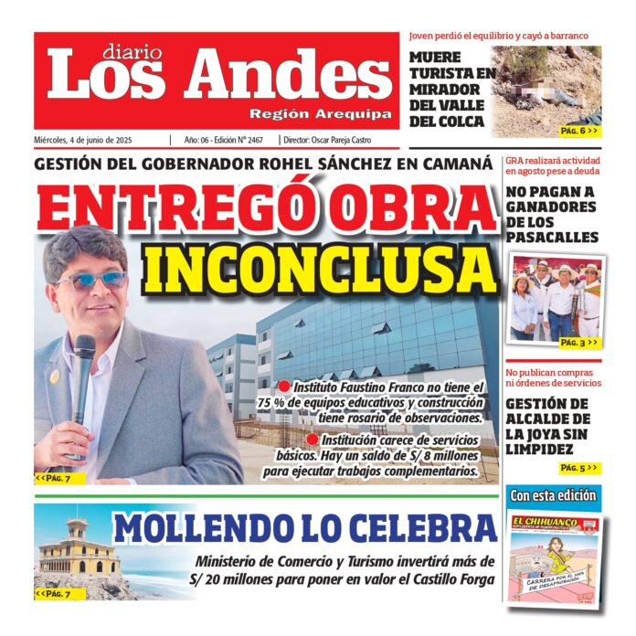 Por: Diario los Andes Fecha: junio 4, 2025 DIARIO DIGITAL AREQUIPA: Diario los Andes 04/06/2025 Vistas: 51 Artículo anteriorPUNO: Diario los Andes 03/06/2025Artículo siguientePUNO: Diario los Andes 04/06/2025 Diario los Andes Compartir post: FacebookTwitterPinterestWhatsApp Suscríbete Quiero entrar He leído y acepto la Política de Privacidad. Populares Puno: Buscaron la reelección y se estrellaron con la valla Puno: Consejeros vuelven sin pena, ni gloria Puno: Anuncian marcha por fraude DIARIO LOS ANDES PUNO: 15/04/2026 DIARIO LOS ANDES AREQUIPA: 15/04/2026 Más vistosMás vistos Puno: Buscaron la reelección y se estrellaron con la valla admineditor - abril 15, 2026 Los congresista por Puno que intentaron reelegirse en las... Puno: Consejeros vuelven sin pena, ni gloria admineditor - abril 15, 2026 Esta semana se reincorporan a sus labores como consejeros... Puno: Anuncian marcha por fraude admineditor - abril 15, 2026 Fernando Salas convocó en Puno una movilización contra un... DIARIO LOS ANDES PUNO: 15/04/2026 admingeneral - abril 15, 2026