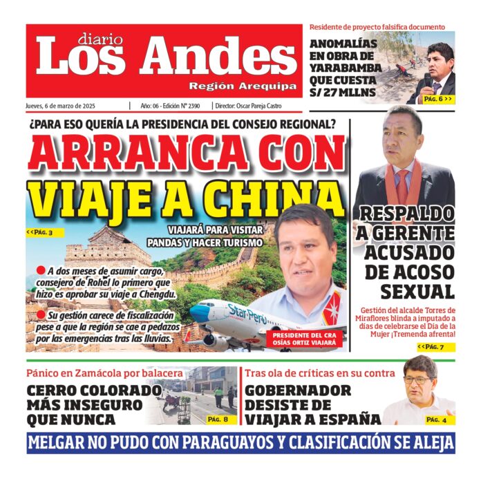 Por: Diario los Andes Fecha: marzo 6, 2025 DIARIO DIGITAL AREQUIPA : Diario los Andes 06/03/2025 Vistas: 14 TagsArequipaDiario DigitalDiario Los Andes Artículo anteriorPUNO : Diario los Andes 05/03/2025Artículo siguientePUNO : Diario los Andes 06/03/2025 Diario los Andes Compartir post: FacebookTwitterPinterestWhatsApp Suscríbete Quiero entrar He leído y acepto la Política de Privacidad. Populares Arequipa: Quejas sobre obra en Yanahuara Incautan mercancía de contrabando valorizada en más de S/32 mil en Desaguadero Liberan más de 31 mil alevinos de Carachi en Lagunillas COER alerta lluvias en provincias del norte de la región Puno Perú conmemora el Día del Poeta en honor a César Vallejo Más vistosMás vistos Arequipa: Quejas sobre obra en Yanahuara admineditor - abril 15, 2026 Redacción: Jean Frisancho Cerraron pase peatonal en puente provisional de... Incautan mercancía de contrabando valorizada en más de S/32 mil en Desaguadero admineditor - abril 15, 2026 Un operativo conjunto entre la Policía Nacional del Perú... Liberan más de 31 mil alevinos de Carachi en Lagunillas admineditor - abril 15, 2026 Un total de 31 mil 800 alevinos de carachi... COER alerta lluvias en provincias del norte de la región Puno admineditor - abril 15, 2026 El Centro de Operaciones de Emergencia Regional - COER...