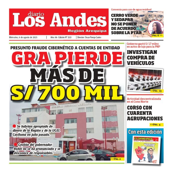Por: Diario los Andes Fecha: agosto 6, 2025 DIARIO DIGITAL AREQUIPA: Diario Los Andes 06/08/2025 Vistas: 62 TagsArequipaDiario DigitalDiario Los Andes Artículo anteriorPUNO: Diario Los Andes 05/08/2025Artículo siguientePUNO: Diario Los Andes 06/08/2025 Diario los Andes Compartir post: FacebookTwitterPinterestWhatsApp Suscríbete Quiero entrar He leído y acepto la Política de Privacidad. Populares Semanario Los Andes 13/04/2026 DIARIO LOS ANDES AREQUIPA: 12/04/2026 DIARIO LOS ANDES PUNO: 12/04/26 Arequipa: Precio del balón supera los S/50 en últimas semanas Arequipa: Detienen a adulto mayor acusado de tocamientos indebidos a menor Más vistosMás vistos Semanario Los Andes 13/04/2026 admingeneral - abril 12, 2026 DIARIO LOS ANDES AREQUIPA: 12/04/2026 admingeneral - abril 11, 2026 DIARIO LOS ANDES PUNO: 12/04/26 admingeneral - abril 11, 2026 Arequipa: Precio del balón supera los S/50 en últimas semanas admineditor - abril 11, 2026 Redacción: Jessimiel Rosas En el distrito de Cayma, el precio...