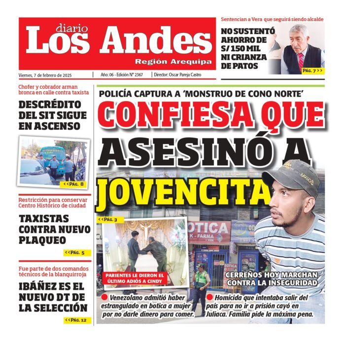 Por: Diario los Andes Fecha: febrero 7, 2025 DIARIO DIGITAL AREQUIPA : Diario los Andes 07/02/2025 Vistas: 14 TagsArequipaDiario DigitalDiario Los Andes Artículo anteriorPUNO : Diario los Andes 06/02/2025Artículo siguientePUNO : Diario los Andes 07/02/2025 Diario los Andes Compartir post: FacebookTwitterPinterestWhatsApp Suscríbete Quiero entrar He leído y acepto la Política de Privacidad. Populares Arequipa: Padre encuentra a su hijo desaparecido en la calle tras un mes de búsqueda Investigan presunta red de corrupción en el Municipio de Puno Ejecutarán acondicionamiento térmico en 10 colegios de la región UGEL San Román expone a los niños al sarampión Aimaras claman por indulto para Aduviri Más vistosMás vistos Arequipa: Padre encuentra a su hijo desaparecido en la calle tras un mes de búsqueda admineditor - abril 22, 2026 Redacción: Jessimiel Rosas Un padre encontró a su hijo desaparecido... Investigan presunta red de corrupción en el Municipio de Puno admineditor - abril 22, 2026 La Fiscalía Provincial Especializada en Delitos de Corrupción de... Ejecutarán acondicionamiento térmico en 10 colegios de la región admineditor - abril 22, 2026 El Programa Nacional de Infraestructura Educativa (Pronied), ejecutará intervenciones... UGEL San Román expone a los niños al sarampión admineditor - abril 22, 2026 Director parece ignorar los 32 casos que se han...