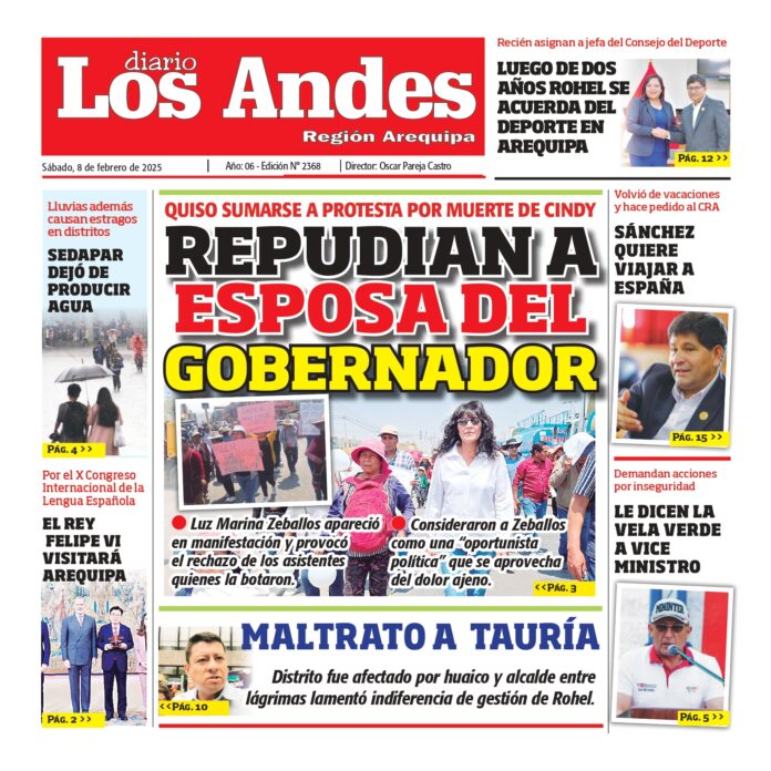 Por: Diario los Andes Fecha: febrero 8, 2025 DIARIO DIGITAL AREQUIPA : Diario los Andes 08/02/2025 Vistas: 32 TagsArequipaDiario DigitalDiario Los Andes Artículo anteriorPUNO : Diario los Andes 08/02/2025Artículo siguienteAREQUIPA : Diario los Andes 09/02/2025 Diario los Andes Compartir post: FacebookTwitterPinterestWhatsApp Suscríbete Quiero entrar He leído y acepto la Política de Privacidad. Populares Arequipa: Padre encuentra a su hijo desaparecido en la calle tras un mes de búsqueda Investigan presunta red de corrupción en el Municipio de Puno Ejecutarán acondicionamiento térmico en 10 colegios de la región UGEL San Román expone a los niños al sarampión Aimaras claman por indulto para Aduviri Más vistosMás vistos Arequipa: Padre encuentra a su hijo desaparecido en la calle tras un mes de búsqueda admineditor - abril 22, 2026 Redacción: Jessimiel Rosas Un padre encontró a su hijo desaparecido... Investigan presunta red de corrupción en el Municipio de Puno admineditor - abril 22, 2026 La Fiscalía Provincial Especializada en Delitos de Corrupción de... Ejecutarán acondicionamiento térmico en 10 colegios de la región admineditor - abril 22, 2026 El Programa Nacional de Infraestructura Educativa (Pronied), ejecutará intervenciones... UGEL San Román expone a los niños al sarampión admineditor - abril 22, 2026 Director parece ignorar los 32 casos que se han...