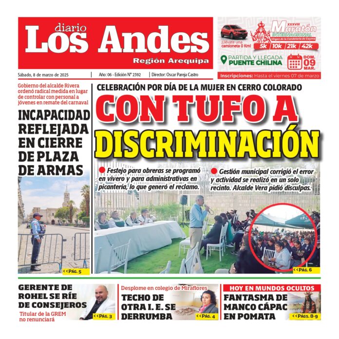 Por: Diario los Andes Fecha: marzo 8, 2025 DIARIO DIGITAL AREQUIPA : Diario los Andes 08/03/2025 Vistas: 20 TagsArequipaDiario DigitalDiario Virtual Artículo anteriorPUNO : Diario los Andes 07/03/2025Artículo siguientePUNO : Diario los Andes 08/03/2025 Diario los Andes Compartir post: FacebookTwitterPinterestWhatsApp Suscríbete Quiero entrar He leído y acepto la Política de Privacidad. Populares Arequipa: Ninguno participó en la sesión solemne por los 37 años del Gobierno Regional Arequipa: Quejas sobre obra en Yanahuara Incautan mercancía de contrabando valorizada en más de S/32 mil en Desaguadero Liberan más de 31 mil alevinos de Carachi en Lagunillas COER alerta lluvias en provincias del norte de la región Puno Más vistosMás vistos Arequipa: Ninguno participó en la sesión solemne por los 37 años del Gobierno Regional admineditor - abril 15, 2026 Redacción: Jean Frisancho Consejeros no asistieron a ceremonia de la... Arequipa: Quejas sobre obra en Yanahuara admineditor - abril 15, 2026 Redacción: Jean Frisancho Cerraron pase peatonal en puente provisional de... Incautan mercancía de contrabando valorizada en más de S/32 mil en Desaguadero admineditor - abril 15, 2026 Un operativo conjunto entre la Policía Nacional del Perú... Liberan más de 31 mil alevinos de Carachi en Lagunillas admineditor - abril 15, 2026 Un total de 31 mil 800 alevinos de carachi...