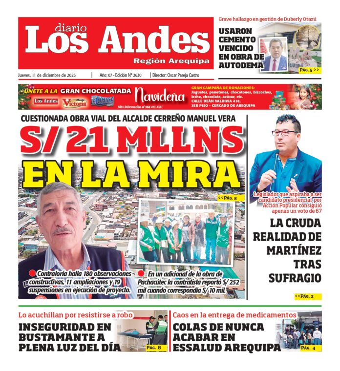 Por: Diario los Andes Fecha: diciembre 11, 2025 DIARIO DIGITAL AREQUIPA: Diario Los Andes 11/12/2025 Vistas: 221 Artículo anteriorPUNO: Diario Los Andes 10/12/2025Artículo siguientePUNO: Diario Los Andes 11/12/2025 Diario los Andes Compartir post: FacebookTwitterPinterestWhatsApp Suscríbete Quiero entrar He leído y acepto la Política de Privacidad. Populares Arequipa: Cuarenta comisarías en riesgo de colapso Arequipa: GREA solicitó 141 aulas prefabricadas para cubrir necesidad Transportistas protestaron en el frontis de la comuna pidiendo que se permita el cobro de S/ 1.50 Precario inicio del año escolar 2026 en colegio Mariano H. Cornejo en Juliaca Puno: Multarán con S/330 mil por propaganda Más vistosMás vistos Arequipa: Cuarenta comisarías en riesgo de colapso Diario los Andes - marzo 17, 2026 Redacción: Julissa Aquino Al menos 40 comisarías de la Región... Arequipa: GREA solicitó 141 aulas prefabricadas para cubrir necesidad Diario los Andes - marzo 17, 2026 Redacción: Thais Astoquilca Rivera A pesar del inicio del año... Transportistas protestaron en el frontis de la comuna pidiendo que se permita el cobro de S/ 1.50 Diario los Andes - marzo 17, 2026 Redacción: Diario Los Andes Este jueves, en sesión extraordinaria,... Precario inicio del año escolar 2026 en colegio Mariano H. Cornejo en Juliaca Diario los Andes - marzo 17, 2026 Redacción: Reynaldo Puma Comercio 32 sin maestros, aulas dignas ni...