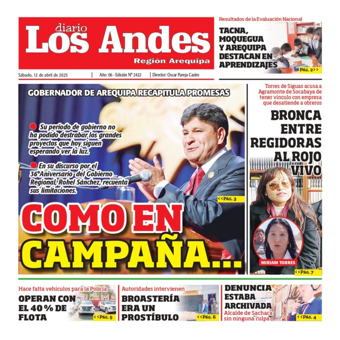 Por: Diario los Andes Fecha: abril 12, 2025 DIARIO DIGITAL AREQUIPA: Diario los Andes 12/04/2025 Vistas: 12 TagsArequipaDiario DigitalDiario Los Andes Artículo anteriorPUNO: Diario los Andes 11/04/2025Artículo siguientePUNO: Diario los Andes 12/04/2025 Diario los Andes Compartir post: FacebookTwitterPinterestWhatsApp Suscríbete Quiero entrar He leído y acepto la Política de Privacidad. Populares Crean la Universidad Nacional Tecnológica Intercultural de Pomata Puno: Detectan conexiones clandestinas de aguas residuales Puno: Sereno grave tras ser embestido por combi de empresa “Dorado” Contraloría dispone que regidores y consejeros rindan cuentas Puno: Alianza con dirigentes magisteriales fue clave Más vistosMás vistos Crean la Universidad Nacional Tecnológica Intercultural de Pomata admineditor - abril 14, 2026 En el diario oficial El Peruano, se publicó la... Puno: Detectan conexiones clandestinas de aguas residuales admineditor - abril 14, 2026 La comuna provincial de Puno en coordinación con EMSA... Puno: Sereno grave tras ser embestido por combi de empresa “Dorado” admineditor - abril 14, 2026 Un agente de Serenazgo de la Municipalidad de Puno... Contraloría dispone que regidores y consejeros rindan cuentas admineditor - abril 14, 2026 La Contraloría General de la República dispuso que regidores...