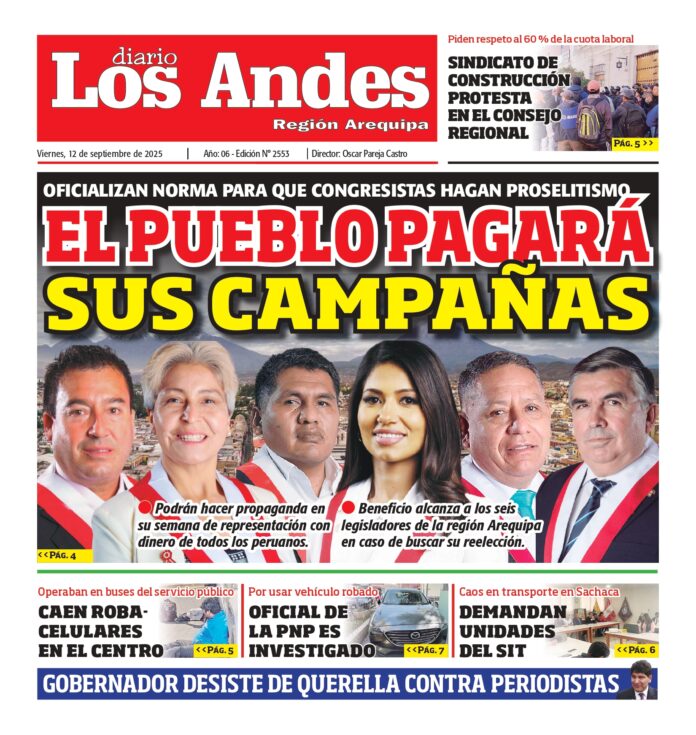 Por: Diario los Andes Fecha: septiembre 12, 2025 DIARIO DIGITAL AREQUIPA: Diario Los Andes 12/09/2025 Vistas: 42 TagsArequipaDiario DigitalDiario Los Andes Artículo anteriorPUNO: Diario Los Andes 12/09/2025Artículo siguienteAREQUIPA: Diario Los Andes 13/09/2025 Diario los Andes Compartir post: FacebookTwitterPinterestWhatsApp Suscríbete Quiero entrar He leído y acepto la Política de Privacidad. Populares DIARIO LOS ANDES PUNO: 16/04/2026 DIARIO LOS ANDES AREQUIPA: 16/04/2026 Arequipa: Ninguno participó en la sesión solemne por los 37 años del Gobierno Regional Arequipa: Quejas sobre obra en Yanahuara Incautan mercancía de contrabando valorizada en más de S/32 mil en Desaguadero Más vistosMás vistos DIARIO LOS ANDES PUNO: 16/04/2026 admingeneral - abril 16, 2026 DIARIO LOS ANDES AREQUIPA: 16/04/2026 admingeneral - abril 16, 2026 Arequipa: Ninguno participó en la sesión solemne por los 37 años del Gobierno Regional admineditor - abril 15, 2026 Redacción: Jean Frisancho Consejeros no asistieron a ceremonia de la... Arequipa: Quejas sobre obra en Yanahuara admineditor - abril 15, 2026 Redacción: Jean Frisancho Cerraron pase peatonal en puente provisional de...