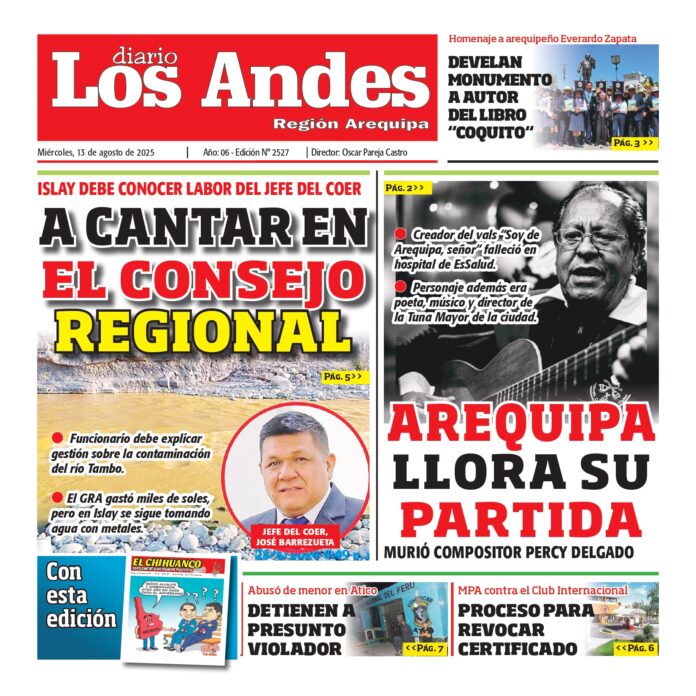 Por: Diario los Andes Fecha: agosto 13, 2025 DIARIO DIGITAL AREQUIPA: Diario Los Andes 13/08/2025 Vistas: 35 Artículo anteriorPUNO: Diario Los Andes 12/08/2025Artículo siguientePUNO: Diario Los Andes 13/08/2025 Diario los Andes Compartir post: FacebookTwitterPinterestWhatsApp Suscríbete Quiero entrar He leído y acepto la Política de Privacidad. Populares Crean la Universidad Nacional Tecnológica Intercultural de Pomata Puno: Detectan conexiones clandestinas de aguas residuales Puno: Sereno grave tras ser embestido por combi de empresa “Dorado” Contraloría dispone que regidores y consejeros rindan cuentas Puno: Alianza con dirigentes magisteriales fue clave Más vistosMás vistos Crean la Universidad Nacional Tecnológica Intercultural de Pomata admineditor - abril 14, 2026 En el diario oficial El Peruano, se publicó la... Puno: Detectan conexiones clandestinas de aguas residuales admineditor - abril 14, 2026 La comuna provincial de Puno en coordinación con EMSA... Puno: Sereno grave tras ser embestido por combi de empresa “Dorado” admineditor - abril 14, 2026 Un agente de Serenazgo de la Municipalidad de Puno... Contraloría dispone que regidores y consejeros rindan cuentas admineditor - abril 14, 2026 La Contraloría General de la República dispuso que regidores...