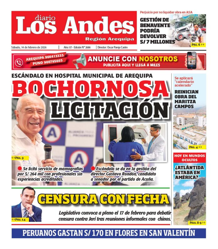 Por: Diario los Andes Fecha: febrero 14, 2026 DIARIO DIGITAL AREQUIPA: Diario Los Andes 14/02/2026 Vistas: 54 Artículo anteriorPUNO: Diario Los Andes 14/02/2026Artículo siguientePUNO: Diario Los Andes 15/02/2026 Diario los Andes Compartir post: FacebookTwitterPinterestWhatsApp Suscríbete Quiero entrar He leído y acepto la Política de Privacidad. Populares Semanario Los Andes 09/03/2026 DIARIO LOS ANDES PUNO: 08/03/2026 DIARIO LOS ANDES AREQUIPA: 08/03/2026 Pescadores artesanales advierten paro indefinido contra Produce Salvataje rescata a 259 bañistas en playas de Arequipa Más vistosMás vistos Semanario Los Andes 09/03/2026 Diario los Andes - marzo 8, 2026 DIARIO LOS ANDES PUNO: 08/03/2026 Diario los Andes - marzo 8, 2026 DIARIO LOS ANDES AREQUIPA: 08/03/2026 Diario los Andes - marzo 8, 2026 Pescadores artesanales advierten paro indefinido contra Produce Diario los Andes - marzo 7, 2026 Redacción: Jessimiel Rosas Pescadores artesanales de la Macrosur advirtieron que...