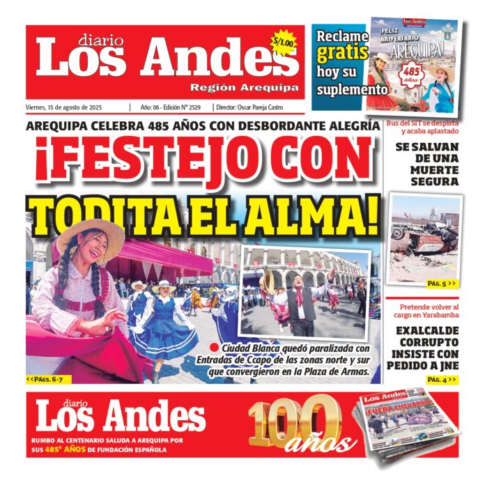 Por: Diario los Andes Fecha: agosto 15, 2025 DIARIO DIGITAL AREQUIPA: Diario Los Andes 15/08/2025 Vistas: 28 TagsArequipaDiario DigitalDiario Los Andes Artículo anteriorAREQUIPA: Diario Los Andes 14/08/2025Artículo siguientePUNO: Diario Los Andes 15/08/2025 Diario los Andes Compartir post: FacebookTwitterPinterestWhatsApp Suscríbete Quiero entrar He leído y acepto la Política de Privacidad. Populares Arequipa: A clases virtuales por paro del SIT Tránsito libre en Arequipa y costo del pasaje sin control Puno: Obrero fallece al caer de cuarto piso en la urbanización Simón Bolívar Juliaca: Grifos acaparan combustible pero ellos aseguran escasez Juliaca: Retiran propaganda electoral instalados en áreas verdes de la ciudad Más vistosMás vistos Arequipa: A clases virtuales por paro del SIT Diario los Andes - marzo 12, 2026 Redacción: Thais Astoquilca Rivera A solo tres días del inicio... Tránsito libre en Arequipa y costo del pasaje sin control Diario los Andes - marzo 12, 2026 Redacción: Julissa Aquino Insostenible. La crisis en el transporte público... Puno: Obrero fallece al caer de cuarto piso en la urbanización Simón Bolívar Diario los Andes - marzo 12, 2026 Redacción: Javier Calderón Un trágico accidente laboral enluta a una... Juliaca: Grifos acaparan combustible pero ellos aseguran escasez Diario los Andes - marzo 12, 2026 Redacción: Reynaldo Puma La fiscal de Prevención del Delito, Marifé...