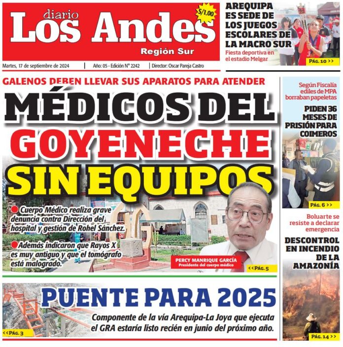 Por: Diario los Andes Fecha: septiembre 17, 2024 DIARIO DIGITAL AREQUIPA: Diario Los Andes 17/09/2024 Vistas: 12 Artículo anteriorPUNO: Diario Los Andes 16/09/2024Artículo siguientePUNO: Diario Los Andes 17/09/2024 Diario los Andes Compartir post: FacebookTwitterPinterestWhatsApp Suscríbete Quiero entrar He leído y acepto la Política de Privacidad. Populares Puno: Actividad de Renovación Popular se llevó a cabo con poca gente y casi a ocultas DIARIO LOS ANDES AREQUIPA: 17/03/2026 DIARIO LOS ANDES PUNO: 17/03/2026 Rescatan a cría de oso andino que vivía en cautiverio Postulante a la UNA Puno fue intervenido con audífono espía Más vistosMás vistos Puno: Actividad de Renovación Popular se llevó a cabo con poca gente y casi a ocultas Diario los Andes - marzo 17, 2026 Redacción: J. Carlos Flores Vargas Absalón Vásquez pasó por Puno... DIARIO LOS ANDES AREQUIPA: 17/03/2026 Diario los Andes - marzo 17, 2026 DIARIO LOS ANDES PUNO: 17/03/2026 Diario los Andes - marzo 17, 2026 Rescatan a cría de oso andino que vivía en cautiverio Diario los Andes - marzo 16, 2026 Redacción: Jessimiel Rosas El Servicio Nacional Forestal y de Fauna...