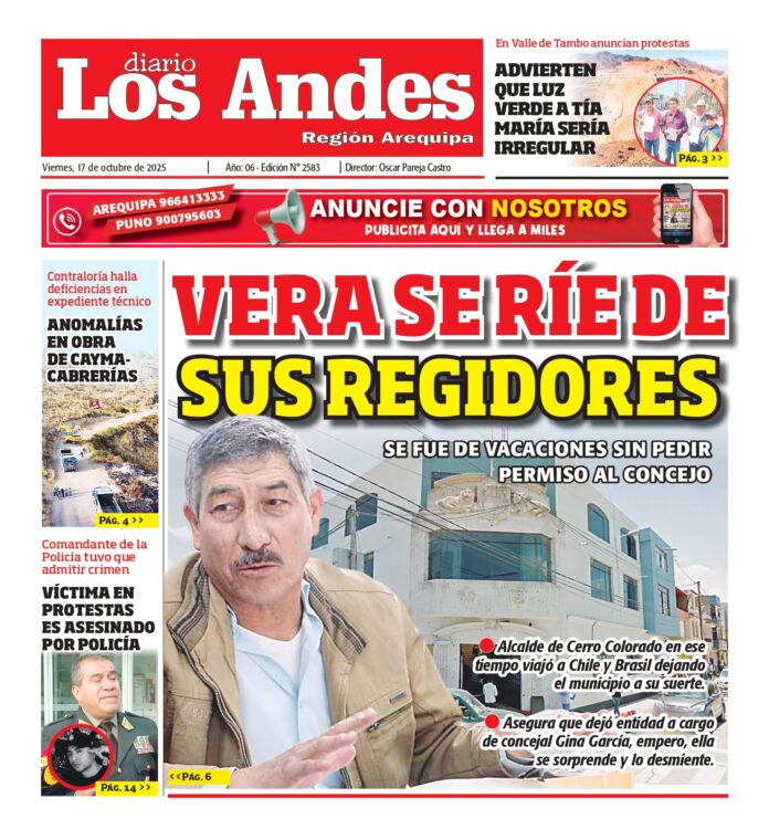 Por: Diario los Andes Fecha: octubre 17, 2025 DIARIO DIGITAL AREQUIPA: Diario Los Andes 17/10/2025 Vistas: 66 Artículo anteriorPUNO: Diario Los Andes 16/10/2025Artículo siguientePUNO: Diario Los Andes 17/10/2025 Diario los Andes Compartir post: FacebookTwitterPinterestWhatsApp Suscríbete Quiero entrar He leído y acepto la Política de Privacidad. Populares Puno: Buscaron la reelección y se estrellaron con la valla Puno: Consejeros vuelven sin pena, ni gloria Puno: Anuncian marcha por fraude DIARIO LOS ANDES PUNO: 15/04/2026 DIARIO LOS ANDES AREQUIPA: 15/04/2026 Más vistosMás vistos Puno: Buscaron la reelección y se estrellaron con la valla admineditor - abril 15, 2026 Los congresista por Puno que intentaron reelegirse en las... Puno: Consejeros vuelven sin pena, ni gloria admineditor - abril 15, 2026 Esta semana se reincorporan a sus labores como consejeros... Puno: Anuncian marcha por fraude admineditor - abril 15, 2026 Fernando Salas convocó en Puno una movilización contra un... DIARIO LOS ANDES PUNO: 15/04/2026 admingeneral - abril 15, 2026
