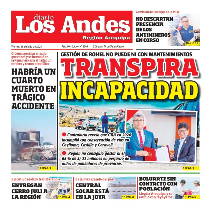 Por: Diario los Andes Fecha: julio 18, 2025 DIARIO DIGITAL AREQUIPA: Diario los Andes 18/07/2025 Vistas: 23 TagsArequipaDiario DigitalDiario Los Andes Artículo anteriorPUNO: Diario los Andes 18/07/2025Artículo siguientePUNO: Diario los Andes 19/07/2025 Diario los Andes Compartir post: FacebookTwitterPinterestWhatsApp Suscríbete Quiero entrar He leído y acepto la Política de Privacidad. Populares Crean la Universidad Nacional Tecnológica Intercultural de Pomata Puno: Detectan conexiones clandestinas de aguas residuales Puno: Sereno grave tras ser embestido por combi de empresa “Dorado” Contraloría dispone que regidores y consejeros rindan cuentas Puno: Alianza con dirigentes magisteriales fue clave Más vistosMás vistos Crean la Universidad Nacional Tecnológica Intercultural de Pomata admineditor - abril 14, 2026 En el diario oficial El Peruano, se publicó la... Puno: Detectan conexiones clandestinas de aguas residuales admineditor - abril 14, 2026 La comuna provincial de Puno en coordinación con EMSA... Puno: Sereno grave tras ser embestido por combi de empresa “Dorado” admineditor - abril 14, 2026 Un agente de Serenazgo de la Municipalidad de Puno... Contraloría dispone que regidores y consejeros rindan cuentas admineditor - abril 14, 2026 La Contraloría General de la República dispuso que regidores...