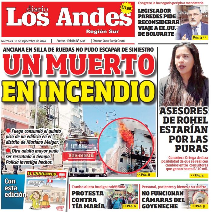 Por: Diario los Andes Fecha: septiembre 18, 2024 DIARIO DIGITAL AREQUIPA: Diario Los Andes 18/09/2024 Vistas: 11 Artículo anteriorPUNO: Diario Los Andes 17/09/2024Artículo siguientePUNO: Diario Los Andes 18/09/2024 Diario los Andes Compartir post: FacebookTwitterPinterestWhatsApp Suscríbete Quiero entrar He leído y acepto la Política de Privacidad. Populares Puno: Actividad de Renovación Popular se llevó a cabo con poca gente y casi a ocultas DIARIO LOS ANDES AREQUIPA: 17/03/2026 DIARIO LOS ANDES PUNO: 17/03/2026 Rescatan a cría de oso andino que vivía en cautiverio Postulante a la UNA Puno fue intervenido con audífono espía Más vistosMás vistos Puno: Actividad de Renovación Popular se llevó a cabo con poca gente y casi a ocultas Diario los Andes - marzo 17, 2026 Redacción: J. Carlos Flores Vargas Absalón Vásquez pasó por Puno... DIARIO LOS ANDES AREQUIPA: 17/03/2026 Diario los Andes - marzo 17, 2026 DIARIO LOS ANDES PUNO: 17/03/2026 Diario los Andes - marzo 17, 2026 Rescatan a cría de oso andino que vivía en cautiverio Diario los Andes - marzo 16, 2026 Redacción: Jessimiel Rosas El Servicio Nacional Forestal y de Fauna...