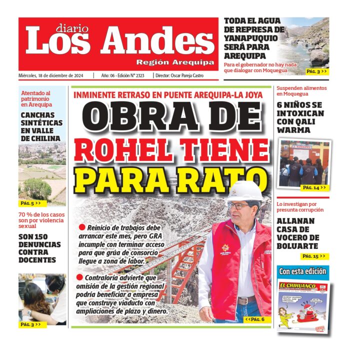 Por: Diario los Andes Fecha: diciembre 18, 2024 DIARIO DIGITAL AREQUIPA: Diario los Andes 18/12/2024 Vistas: 23 TagsArequipaDiario DigitalDiario Los Andes Artículo anteriorPUNO: Diario los Andes 17/12/2024Artículo siguientePUNO: Diario los Andes 18/12/2024 Diario los Andes Compartir post: FacebookTwitterPinterestWhatsApp Suscríbete Quiero entrar He leído y acepto la Política de Privacidad. Populares DIARIO LOS ANDES AREQUIPA: 22/04/26 DIARIO LOS ANDES PUNO: 22/04/26 Arequipa: Clínica sin autorización para cirugías es investigada tras muerte de joven Perú logra 23 medallas en los IV Juegos Suramericanos de la Juventud Panamá 2026 Arequipa: Vecinos de Huacapuy rechazan proyecto de crematorio en zona urbana de Camaná Más vistosMás vistos DIARIO LOS ANDES AREQUIPA: 22/04/26 admingeneral - abril 21, 2026 DIARIO LOS ANDES PUNO: 22/04/26 admingeneral - abril 21, 2026 Arequipa: Clínica sin autorización para cirugías es investigada tras muerte de joven admineditor - abril 21, 2026 Redacción: Jessimiel Rosas La muerte de una joven madre de... Perú logra 23 medallas en los IV Juegos Suramericanos de la Juventud Panamá 2026 admineditor - abril 21, 2026 La delegación peruana continúa destacando en los IV Juegos...