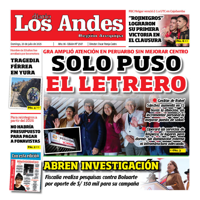 Por: Diario los Andes Fecha: julio 20, 2025 DIARIO DIGITAL Arequipa: Diario Los Andes 20/07/2025 Vistas: 26 Artículo anteriorPUNO: Diario los Andes 20/07/2025Artículo siguienteSemanario Los Andes 21/07/2025 Diario los Andes Compartir post: FacebookTwitterPinterestWhatsApp Suscríbete Quiero entrar He leído y acepto la Política de Privacidad. Populares JNE recibió más de 5 mil solicitudes de dispensa y justificación electoral Incautan mercadería de contrabando en la vía Moho-Huancané UNA Puno acumula deuda por arbitrios municipales por cerca a S/180 mil Denunció a policías por robo y coima en Cayma Mañoso es detenido tras grave acusación Más vistosMás vistos JNE recibió más de 5 mil solicitudes de dispensa y justificación electoral admineditor - abril 16, 2026 El Jurado Nacional de Elecciones (JNE) recibió un total... Incautan mercadería de contrabando en la vía Moho-Huancané admineditor - abril 16, 2026 Personal del Área de Policía Fiscal Juliaca ejecutó el... UNA Puno acumula deuda por arbitrios municipales por cerca a S/180 mil admineditor - abril 16, 2026 La Universidad Nacional del Altiplano de Puno mantiene una... Denunció a policías por robo y coima en Cayma admineditor - abril 16, 2026 Redacción: Thais Astoquilca Rivera Chofer los acusó tras ser amenazado...