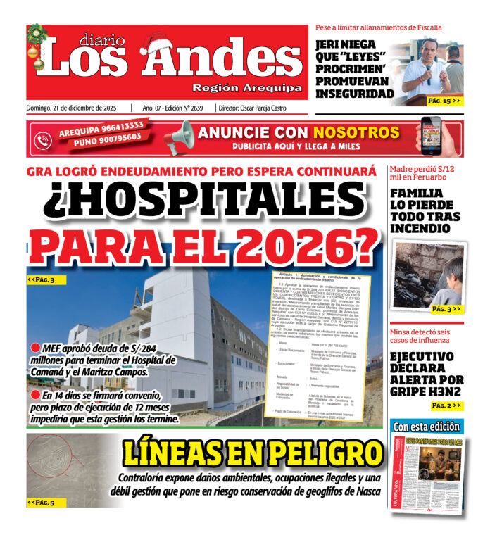 Por: Diario los Andes Fecha: diciembre 21, 2025 DIARIO DIGITAL AREQUIPA: Diario Los Andes 21/12/2025 Vistas: 187 Artículo anteriorPUNO: Diario Los Andes 21/12/2025Artículo siguienteSemanario Los Andes 22/12/2025 Diario los Andes Compartir post: FacebookTwitterPinterestWhatsApp Suscríbete Quiero entrar He leído y acepto la Política de Privacidad. Populares DIARIO LOS ANDES PUNO: 26/03/26 DIARIO LOS ANDES AREQUIPA: 26/03/26 Seguridad en Arequipa limitada por falta de vehículos y agentes policiales Arequipa: Cobran hasta S/1.50 pese a tarifa oficial de S/1.30 en el SIT Arequipa: Actividades de Semana Santa comienzan con Vía Crucis en la Plaza de Armas Más vistosMás vistos DIARIO LOS ANDES PUNO: 26/03/26 Diario los Andes - marzo 26, 2026 DIARIO LOS ANDES AREQUIPA: 26/03/26 Diario los Andes - marzo 26, 2026 Seguridad en Arequipa limitada por falta de vehículos y agentes policiales Diario los Andes - marzo 25, 2026 La región Arequipa enfrenta limitaciones en su capacidad de... Arequipa: Cobran hasta S/1.50 pese a tarifa oficial de S/1.30 en el SIT Diario los Andes - marzo 25, 2026 La Municipalidad Provincial de Arequipa oficializó desde hoy el...