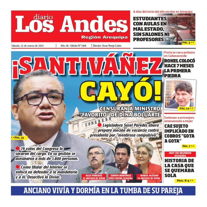 Por: Diario los Andes Fecha: marzo 22, 2025 DIARIO DIGITAL AREQUIPA : Diario los Andes 22/03/2025 Vistas: 14 TagsArequipaDiario DigitalDiario Los Andes Artículo anteriorPUNO : Diario los Andes 21/03/2025Artículo siguientePUNO : Diario los Andes 22/03/2025 Diario los Andes Compartir post: FacebookTwitterPinterestWhatsApp Suscríbete Quiero entrar He leído y acepto la Política de Privacidad. Populares Arequipa: Ninguno participó en la sesión solemne por los 37 años del Gobierno Regional Arequipa: Quejas sobre obra en Yanahuara Incautan mercancía de contrabando valorizada en más de S/32 mil en Desaguadero Liberan más de 31 mil alevinos de Carachi en Lagunillas COER alerta lluvias en provincias del norte de la región Puno Más vistosMás vistos Arequipa: Ninguno participó en la sesión solemne por los 37 años del Gobierno Regional admineditor - abril 15, 2026 Redacción: Jean Frisancho Consejeros no asistieron a ceremonia de la... Arequipa: Quejas sobre obra en Yanahuara admineditor - abril 15, 2026 Redacción: Jean Frisancho Cerraron pase peatonal en puente provisional de... Incautan mercancía de contrabando valorizada en más de S/32 mil en Desaguadero admineditor - abril 15, 2026 Un operativo conjunto entre la Policía Nacional del Perú... Liberan más de 31 mil alevinos de Carachi en Lagunillas admineditor - abril 15, 2026 Un total de 31 mil 800 alevinos de carachi...