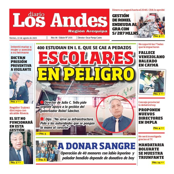 Por: Diario los Andes Fecha: agosto 22, 2025 DIARIO DIGITAL AREQUIPA: Diario Los Andes 22/08/2025 Vistas: 25 TagsArequipaDiario DigitalDiario Los Andes Artículo anteriorPUNO: Diario Los Andes 21/08/2025Artículo siguientePUNO: Diario Los Andes 22/08/2025 Diario los Andes Compartir post: FacebookTwitterPinterestWhatsApp Suscríbete Quiero entrar He leído y acepto la Política de Privacidad. Populares Arequipa: Ambulantes persisten en San Camilo pese a operativos municipales Arequipa: Detienen a presunto estafador por venta de cerveza adulterada Atlético Grau y Alianza Atlético enfrentan duros retos en la fecha 12 del Apertura Perú recupera 18 bienes culturales repatriados desde Estados Unidos Arequipa: Colapso de desagüe inunda 3 viviendas Más vistosMás vistos Arequipa: Ambulantes persisten en San Camilo pese a operativos municipales admineditor - abril 25, 2026 El comercio informal sigue presente en los alrededores del... Arequipa: Detienen a presunto estafador por venta de cerveza adulterada admineditor - abril 25, 2026 Redacción: Jessimiel Rosas Agentes de la unidad de Halcones de... Atlético Grau y Alianza Atlético enfrentan duros retos en la fecha 12 del Apertura admineditor - abril 25, 2026 Redacción: Jessimiel Rosas La fecha 12 del Torneo Apertura de... Perú recupera 18 bienes culturales repatriados desde Estados Unidos admineditor - abril 25, 2026 Redacción: Jessimiel Rosas El Ministerio de Cultura del Perú verificó...