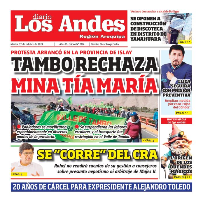 Por: Diario los Andes Fecha: octubre 22, 2024 DIARIO DIGITAL AREQUIPA: Diario los Andes 22/10/2024 Vistas: 15 Artículo anteriorSemanario Los Andes 21/10/2024Artículo siguientePUNO: Diario los Andes 22/10/2024 Diario los Andes Compartir post: FacebookTwitterPinterestWhatsApp Suscríbete Quiero entrar He leído y acepto la Política de Privacidad. Populares DIARIO LOS ANDES PUNO: 16/04/2026 DIARIO LOS ANDES AREQUIPA: 16/04/2026 Arequipa: Ninguno participó en la sesión solemne por los 37 años del Gobierno Regional Arequipa: Quejas sobre obra en Yanahuara Incautan mercancía de contrabando valorizada en más de S/32 mil en Desaguadero Más vistosMás vistos DIARIO LOS ANDES PUNO: 16/04/2026 admingeneral - abril 16, 2026 DIARIO LOS ANDES AREQUIPA: 16/04/2026 admingeneral - abril 16, 2026 Arequipa: Ninguno participó en la sesión solemne por los 37 años del Gobierno Regional admineditor - abril 15, 2026 Redacción: Jean Frisancho Consejeros no asistieron a ceremonia de la... Arequipa: Quejas sobre obra en Yanahuara admineditor - abril 15, 2026 Redacción: Jean Frisancho Cerraron pase peatonal en puente provisional de...