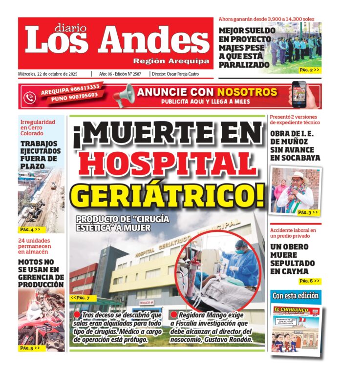 Por: Diario los Andes Fecha: octubre 22, 2025 DIARIO DIGITAL AREQUIPA: Diario Los Andes 22/10/2025 Vistas: 92 Artículo anteriorAREQUIPA: Diario Los Andes 21/10/2025Artículo siguientePUNO: Diario Los Andes 22/10/2025 Diario los Andes Compartir post: FacebookTwitterPinterestWhatsApp Suscríbete Quiero entrar He leído y acepto la Política de Privacidad. Populares JNE recibió más de 5 mil solicitudes de dispensa y justificación electoral Incautan mercadería de contrabando en la vía Moho-Huancané UNA Puno acumula deuda por arbitrios municipales por cerca a S/180 mil Denunció a policías por robo y coima en Cayma Mañoso es detenido tras grave acusación Más vistosMás vistos JNE recibió más de 5 mil solicitudes de dispensa y justificación electoral admineditor - abril 16, 2026 El Jurado Nacional de Elecciones (JNE) recibió un total... Incautan mercadería de contrabando en la vía Moho-Huancané admineditor - abril 16, 2026 Personal del Área de Policía Fiscal Juliaca ejecutó el... UNA Puno acumula deuda por arbitrios municipales por cerca a S/180 mil admineditor - abril 16, 2026 La Universidad Nacional del Altiplano de Puno mantiene una... Denunció a policías por robo y coima en Cayma admineditor - abril 16, 2026 Redacción: Thais Astoquilca Rivera Chofer los acusó tras ser amenazado...