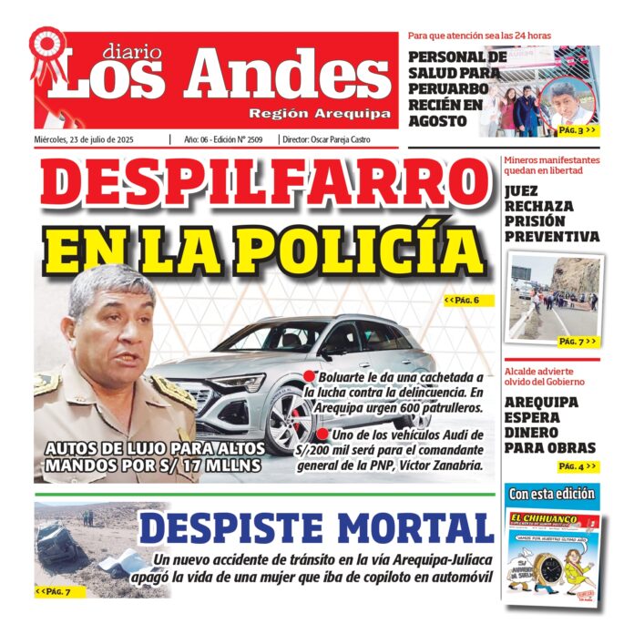 Por: Diario los Andes Fecha: julio 23, 2025 DIARIO DIGITAL Arequipa: Diario Los Andes 23/07/2025 Vistas: 17 TagsArequipaDiario DigitalDiario Los Andes Artículo anteriorPUNO: Diario Los Andes 22/07/2025Artículo siguientePUNO: Diario Los Andes 23/07/2025 Diario los Andes Compartir post: FacebookTwitterPinterestWhatsApp Suscríbete Quiero entrar He leído y acepto la Política de Privacidad. Populares Arequipa: Techo de colegio José Olaya se cae a pedazos Más de 18 mil diabéticos en Puno en riesgo por insulina Si gobierno no da solución Ordet Juliaca hace advertencia: Pasajes subirán desde el lunes 16 Puno: Intervienen discotecas luego de varios pedidos Denuncian presunta agresión de sereno municipal en Portal de Flores en Arequipa Más vistosMás vistos Arequipa: Techo de colegio José Olaya se cae a pedazos Diario los Andes - marzo 14, 2026 Redacción: Julissa Aquino A dos días del inicio del Año... Más de 18 mil diabéticos en Puno en riesgo por insulina Diario los Andes - marzo 14, 2026 Redacción: Reynaldo Puma Más de 18 mil 800 pacientes diabéticos... Si gobierno no da solución Ordet Juliaca hace advertencia: Pasajes subirán desde el lunes 16 Diario los Andes - marzo 14, 2026 Redacción: Reynaldo Puma La Organización de Transportistas (Ordet) de... Puno: Intervienen discotecas luego de varios pedidos Diario los Andes - marzo 14, 2026 Redacción: Diario Los Andes Apenas fue designada como nueva...