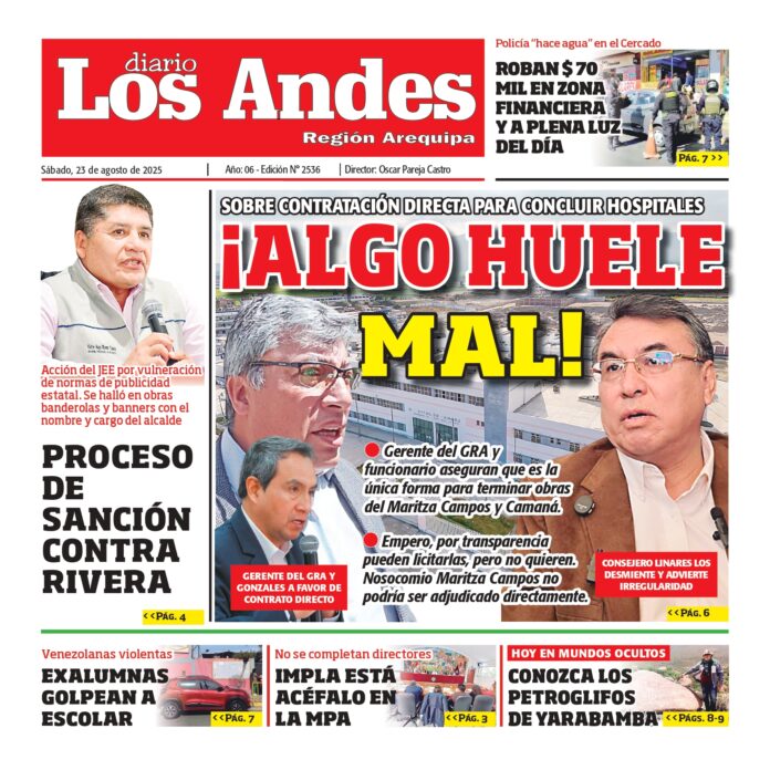 Por: Diario los Andes Fecha: agosto 23, 2025 DIARIO DIGITAL AREQUIPA: Diario Los Andes 23/08/2025 Vistas: 26 TagsArequipaDiario DigitalDiario Los Andes Artículo anteriorPUNO: Diario Los Andes 22/08/2025Artículo siguientePUNO: Diario Los Andes 23/08/2025 Diario los Andes Compartir post: FacebookTwitterPinterestWhatsApp Suscríbete Quiero entrar He leído y acepto la Política de Privacidad. Populares Arequipa: Ambulantes persisten en San Camilo pese a operativos municipales Arequipa: Detienen a presunto estafador por venta de cerveza adulterada Atlético Grau y Alianza Atlético enfrentan duros retos en la fecha 12 del Apertura Perú recupera 18 bienes culturales repatriados desde Estados Unidos Arequipa: Colapso de desagüe inunda 3 viviendas Más vistosMás vistos Arequipa: Ambulantes persisten en San Camilo pese a operativos municipales admineditor - abril 25, 2026 El comercio informal sigue presente en los alrededores del... Arequipa: Detienen a presunto estafador por venta de cerveza adulterada admineditor - abril 25, 2026 Redacción: Jessimiel Rosas Agentes de la unidad de Halcones de... Atlético Grau y Alianza Atlético enfrentan duros retos en la fecha 12 del Apertura admineditor - abril 25, 2026 Redacción: Jessimiel Rosas La fecha 12 del Torneo Apertura de... Perú recupera 18 bienes culturales repatriados desde Estados Unidos admineditor - abril 25, 2026 Redacción: Jessimiel Rosas El Ministerio de Cultura del Perú verificó...