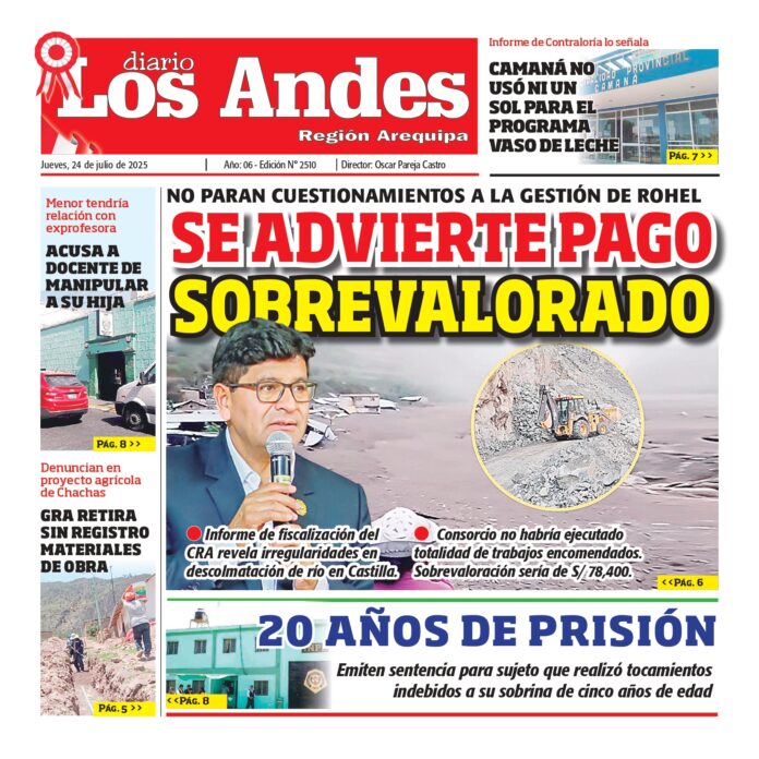 Por: Diario los Andes Fecha: julio 24, 2025 DIARIO DIGITAL AREQUIPA: Diario Los Andes 24/07/2025 Vistas: 19 TagsArequipaDiario DigitalDiario Los Andes Artículo anteriorPUNO: Diario Los Andes 23/07/2025Artículo siguientePUNO: Diario Los Andes 24/07/2025 Diario los Andes Compartir post: FacebookTwitterPinterestWhatsApp Suscríbete Quiero entrar He leído y acepto la Política de Privacidad. Populares DIARIO LOS ANDES PUNO: 08/03/2026 DIARIO LOS ANDES AREQUIPA: 08/03/2026 Pescadores artesanales advierten paro indefinido contra Produce Salvataje rescata a 259 bañistas en playas de Arequipa Puno marcha por igualdad en el Día Internacional de la Mujer Más vistosMás vistos DIARIO LOS ANDES PUNO: 08/03/2026 Diario los Andes - marzo 8, 2026 DIARIO LOS ANDES AREQUIPA: 08/03/2026 Diario los Andes - marzo 8, 2026 Pescadores artesanales advierten paro indefinido contra Produce Diario los Andes - marzo 7, 2026 Redacción: Jessimiel Rosas Pescadores artesanales de la Macrosur advirtieron que... Salvataje rescata a 259 bañistas en playas de Arequipa Diario los Andes - marzo 7, 2026 Redacción: Jessimiel Rosas Un total de 259 personas fueron rescatadas...