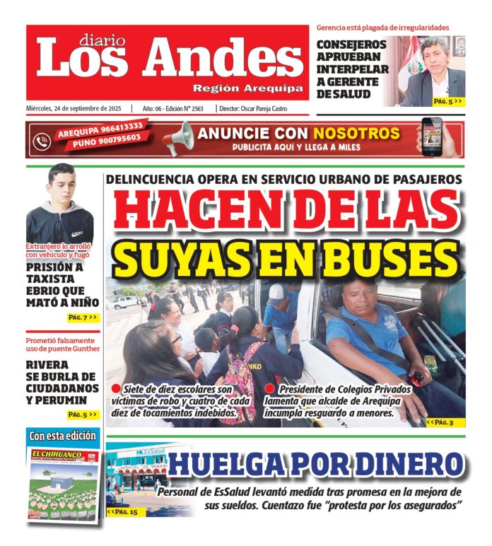 Por: Diario los Andes Fecha: septiembre 23, 2025 DIARIO DIGITAL AREQUIPA: Diario Los Andes 24/09/2025 Vistas: 49 TagsArequipaDiario DigitalDiario Los Andes Artículo anteriorPUNO: Diario Los Andes 24/09/2025Artículo siguientePUNO: Diario Los Andes 25/09/2025 Diario los Andes Compartir post: FacebookTwitterPinterestWhatsApp Suscríbete Quiero entrar He leído y acepto la Política de Privacidad. Populares A 25 se incrementan los casos de sarampión en la región Puno Sal de Maras: el tesoro natural del Perú que conquista cocinas y negocios Voto puneño fue determinante Puno: Varón muere tras presunta caída de cinco metros en Alto Huáscar INCIDENCIAS EN LAS ELECCIONES Más vistosMás vistos A 25 se incrementan los casos de sarampión en la región Puno admineditor - abril 13, 2026 Hasta hoy, lunes 13 de abril, los contagios de... Sal de Maras: el tesoro natural del Perú que conquista cocinas y negocios admineditor - abril 13, 2026 En un contexto donde los consumidores buscan productos naturales,... Voto puneño fue determinante admineditor - abril 13, 2026 Durante la jornada electoral de este 12 de abril... Puno: Varón muere tras presunta caída de cinco metros en Alto Huáscar admineditor - abril 13, 2026 Un lamentable hecho se registró en el barrio Alto...