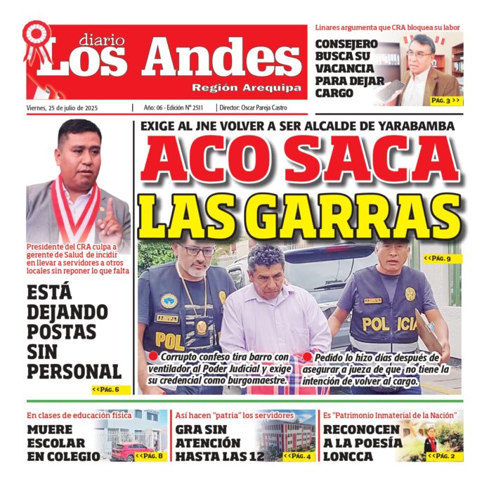 Por: Diario los Andes Fecha: julio 25, 2025 DIARIO DIGITAL AREQUIPA: Diario Los Andes 25/07/2025 Vistas: 36 TagsArequipaDiario DigitalDiario Los Andes Artículo anteriorPUNO: Diario Los Andes 24/07/2025Artículo siguientePUNO: Diario Los Andes 25/07/2025 Diario los Andes Compartir post: FacebookTwitterPinterestWhatsApp Suscríbete Quiero entrar He leído y acepto la Política de Privacidad. Populares Mal servicio de agua en Juliaca Flavio Cruz obtuvo 760 votos al 68 % de conteo DIARIO LOS ANDES PUNO: 14/04/2026 DIARIO LOS ANDES AREQUIPA: 14/04/2026 Emiten alerta ante precipitaciones en siete provincias de la región Puno Más vistosMás vistos Mal servicio de agua en Juliaca admineditor - abril 14, 2026 El exsecretario de las Cuatro Zonas, Antero Pimentel Esquivias,... Flavio Cruz obtuvo 760 votos al 68 % de conteo admineditor - abril 14, 2026 Al 68 % del conteo de votos en la... DIARIO LOS ANDES PUNO: 14/04/2026 admingeneral - abril 14, 2026 DIARIO LOS ANDES AREQUIPA: 14/04/2026 admingeneral - abril 14, 2026
