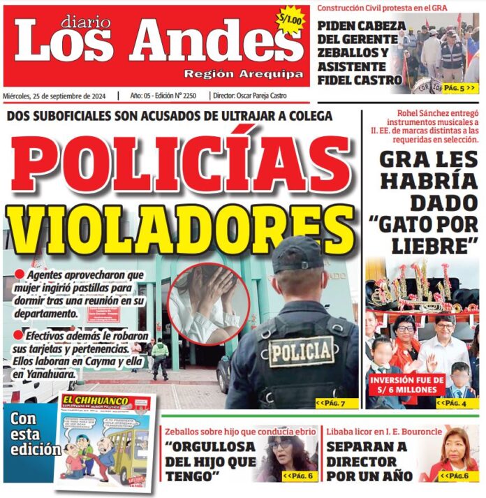 Por: Diario los Andes Fecha: septiembre 25, 2024 DIARIO DIGITAL AREQUIPA: Diario Los Andes 25/09/2024 Vistas: 8 Artículo anteriorPUNO: Diario Los Andes 24/09/2024Artículo siguientePUNO: Diario Los Andes 25/09/2024 Diario los Andes Compartir post: FacebookTwitterPinterestWhatsApp Suscríbete Quiero entrar He leído y acepto la Política de Privacidad. Populares Arequipa: Cuarenta comisarías en riesgo de colapso Arequipa: GREA solicitó 141 aulas prefabricadas para cubrir necesidad Transportistas protestaron en el frontis de la comuna pidiendo que se permita el cobro de S/ 1.50 Precario inicio del año escolar 2026 en colegio Mariano H. Cornejo en Juliaca Puno: Multarán con S/330 mil por propaganda Más vistosMás vistos Arequipa: Cuarenta comisarías en riesgo de colapso Diario los Andes - marzo 17, 2026 Redacción: Julissa Aquino Al menos 40 comisarías de la Región... Arequipa: GREA solicitó 141 aulas prefabricadas para cubrir necesidad Diario los Andes - marzo 17, 2026 Redacción: Thais Astoquilca Rivera A pesar del inicio del año... Transportistas protestaron en el frontis de la comuna pidiendo que se permita el cobro de S/ 1.50 Diario los Andes - marzo 17, 2026 Redacción: Diario Los Andes Este jueves, en sesión extraordinaria,... Precario inicio del año escolar 2026 en colegio Mariano H. Cornejo en Juliaca Diario los Andes - marzo 17, 2026 Redacción: Reynaldo Puma Comercio 32 sin maestros, aulas dignas ni...