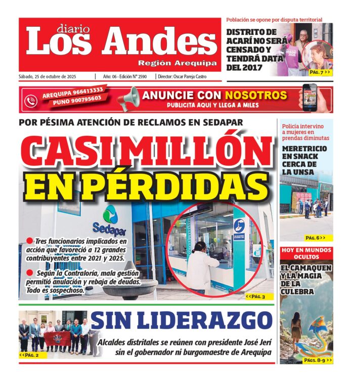 Por: Diario los Andes Fecha: octubre 25, 2025 DIARIO DIGITAL AREQUIPA: Diario Los Andes 25/10/2025 Vistas: 34 Artículo anteriorPUNO: Diario Los Andes 24/10/2025Artículo siguientePUNO: Diario Los Andes 25/10/2025 Diario los Andes Compartir post: FacebookTwitterPinterestWhatsApp Suscríbete Quiero entrar He leído y acepto la Política de Privacidad. Populares Brote de sarampión encuentra ambulancias abandonadas DIARIO LOS ANDES PUNO: 21/04/26 DIARIO LOS ANDES AREQUIPA: 21/04/26 Arequipa: Persecución con disparos deja un detenido y dos heridos Perú suma 20 medallas en los juegos suramericanos de la juventud Panamá 2026 Más vistosMás vistos Brote de sarampión encuentra ambulancias abandonadas admineditor - abril 21, 2026 De acuerdo a denuncias y pruebas llegadas a la... DIARIO LOS ANDES PUNO: 21/04/26 admingeneral - abril 21, 2026 DIARIO LOS ANDES AREQUIPA: 21/04/26 admingeneral - abril 21, 2026 Arequipa: Persecución con disparos deja un detenido y dos heridos admineditor - abril 20, 2026 Redacción: Jessimiel Rosas Una persecución policial con disparos se registró...