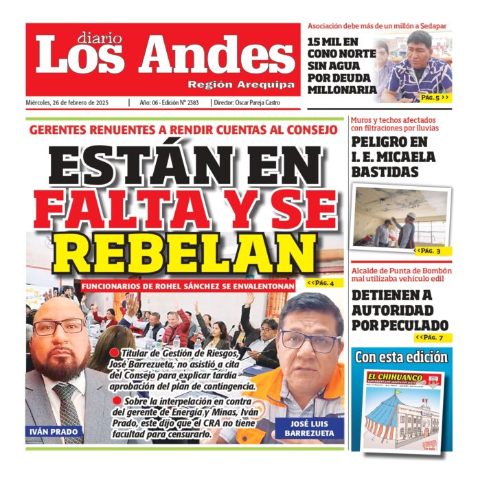 Por: Diario los Andes Fecha: febrero 26, 2025 DIARIO DIGITAL AREQUIPA : Diario los Andes 26/02/2025 Vistas: 34 TagsArequipaDiario DigitalDiario Los Andes Artículo anteriorAREQUIPA : Diario los Andes 25/02/2025Artículo siguientePUNO : Diario los Andes 26/02/2025 Diario los Andes Compartir post: FacebookTwitterPinterestWhatsApp Suscríbete Quiero entrar He leído y acepto la Política de Privacidad. Populares Crean la Universidad Nacional Tecnológica Intercultural de Pomata Puno: Detectan conexiones clandestinas de aguas residuales Puno: Sereno grave tras ser embestido por combi de empresa “Dorado” Contraloría dispone que regidores y consejeros rindan cuentas Puno: Alianza con dirigentes magisteriales fue clave Más vistosMás vistos Crean la Universidad Nacional Tecnológica Intercultural de Pomata admineditor - abril 14, 2026 En el diario oficial El Peruano, se publicó la... Puno: Detectan conexiones clandestinas de aguas residuales admineditor - abril 14, 2026 La comuna provincial de Puno en coordinación con EMSA... Puno: Sereno grave tras ser embestido por combi de empresa “Dorado” admineditor - abril 14, 2026 Un agente de Serenazgo de la Municipalidad de Puno... Contraloría dispone que regidores y consejeros rindan cuentas admineditor - abril 14, 2026 La Contraloría General de la República dispuso que regidores...