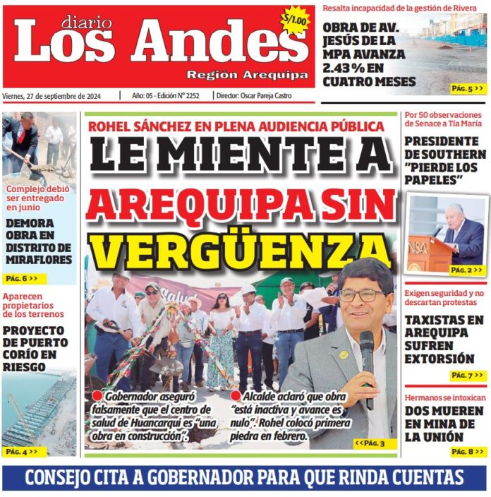 Por: Diario los Andes Fecha: septiembre 27, 2024 DIARIO DIGITAL AREQUIPA: Diario Los Andes 27/09/2024 Vistas: 12 Artículo anteriorPUNO: Diario Los Andes 26/09/2024Artículo siguientePUNO: Diario Los Andes 27/09/2024 Diario los Andes Compartir post: FacebookTwitterPinterestWhatsApp Suscríbete Quiero entrar He leído y acepto la Política de Privacidad. Populares Arequipa: Joven madre asegura que no sabía que estaba embarazada y busca recuperar a su bebé tras presunto abandono en Socabaya Arequipa: Cuarenta comisarías en riesgo de colapso Arequipa: GREA solicitó 141 aulas prefabricadas para cubrir necesidad Transportistas protestaron en el frontis de la comuna pidiendo que se permita el cobro de S/ 1.50 Precario inicio del año escolar 2026 en colegio Mariano H. Cornejo en Juliaca Más vistosMás vistos Arequipa: Joven madre asegura que no sabía que estaba embarazada y busca recuperar a su bebé tras presunto abandono en Socabaya Diario los Andes - marzo 17, 2026 Redacción: Yudith Veronica Taco Huallpa Una joven madre de... Arequipa: Cuarenta comisarías en riesgo de colapso Diario los Andes - marzo 17, 2026 Redacción: Julissa Aquino Al menos 40 comisarías de la Región... Arequipa: GREA solicitó 141 aulas prefabricadas para cubrir necesidad Diario los Andes - marzo 17, 2026 Redacción: Thais Astoquilca Rivera A pesar del inicio del año... Transportistas protestaron en el frontis de la comuna pidiendo que se permita el cobro de S/ 1.50 Diario los Andes - marzo 17, 2026 Redacción: Diario Los Andes Este jueves, en sesión extraordinaria,...