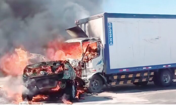 Un automóvil de placa Z4Z-001 y un furgón con matrícula V8H-891 colisionaron violentamente, provocando que el vehículo menor se incendiara por completo. Como consecuencia del impacto, tres ocupantes del auto fallecieron calcinados en el acto.