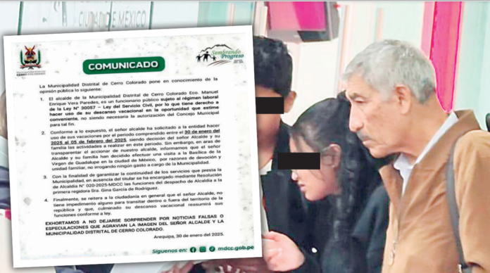 El alcalde de Cerro Colorado, Manuel Vera Paredes, se une al gobernador regional de Arequipa, Rohel Sánchez, al tomar un descanso de su labor. Según un comunicado oficial de la municipalidad, la autoridad edil utilizó sus vacaciones para viajar junto a su familia a México. Este periodo comprenderá desde el 30 de enero hasta el 5 de febrero de 2025. Sin embargo, este viaje podría poner en riesgo a Vera en el cargo.