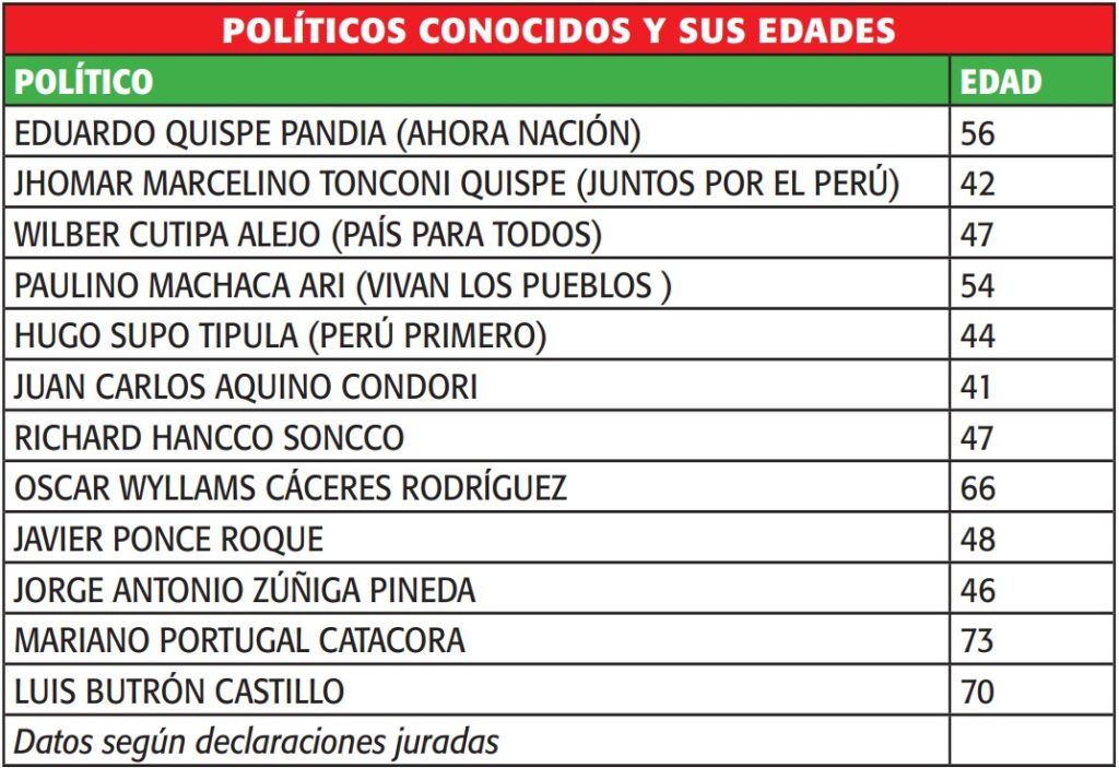 Si se habla de los candidatos presidenciales se encuentra una lista de venerables como Alfonso López Chau (75), César Acuña (72), Jorge del Castillo (75) Yonhy Lescano (66),entre otros. Entre ellos, la menor es Keiko Fujimori que cumple 50 en el 2025.