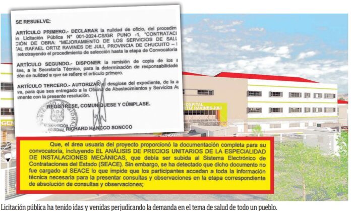 Una vez más, la provincia de Chucuito – Juli, se ha visto perjudicada por la gestión de Richard Hancco al frente del Gobierno Regional. El 15 de octubre se emitió una resolución ejecutiva regional que anula el proceso de selección del contratista para la construcción del hospital Rafael Ortíz Rabines.