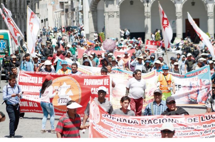 Cientos de afiliados a gremios como Construcción Civil y Sutep, entre otros, circularon por diferentes arterias de la ciudad, y se concentraron en la Plaza de Armas, frente a la Catedral.