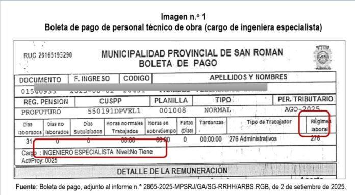 No obstante, la revisión de documentos y boletas de pago evidenció que el personal técnico y administrativo de las obras fue contratado bajo el régimen del D.L. 276. Informes internos de la Gerencia de Administración de la municipalidad, emitidos en agosto y septiembre de 2025, confirmaron que las planillas de dicho personal se generaron bajo ese régimen laboral.