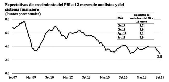 En el tema de la inflación, las expectativas a 12 meses, que desde mayo de 2017 se mantenían dentro del rango meta, se redujeron a 2,2% en setiembre de este año, su nivel más bajo desde abril de 2018.